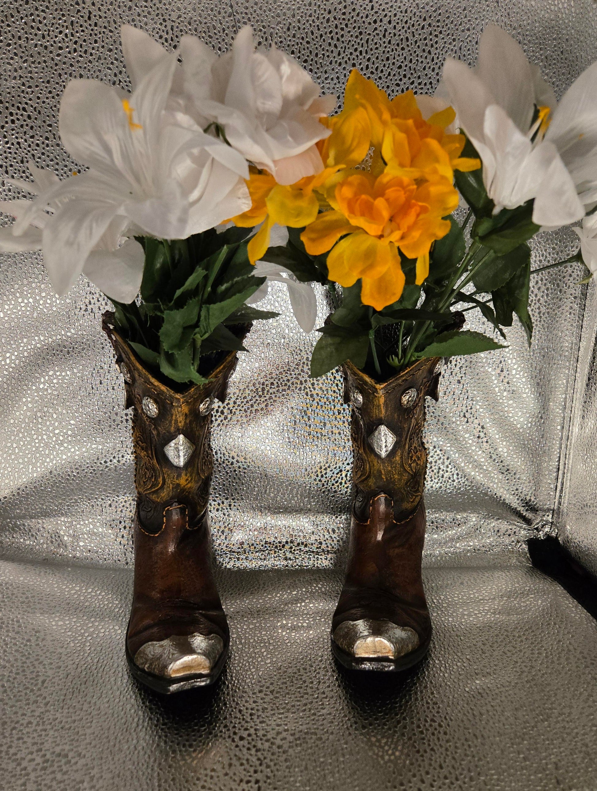 Hand Painted, Resin, Brown cowboy boot shapes with silver toe, heel, and studs.