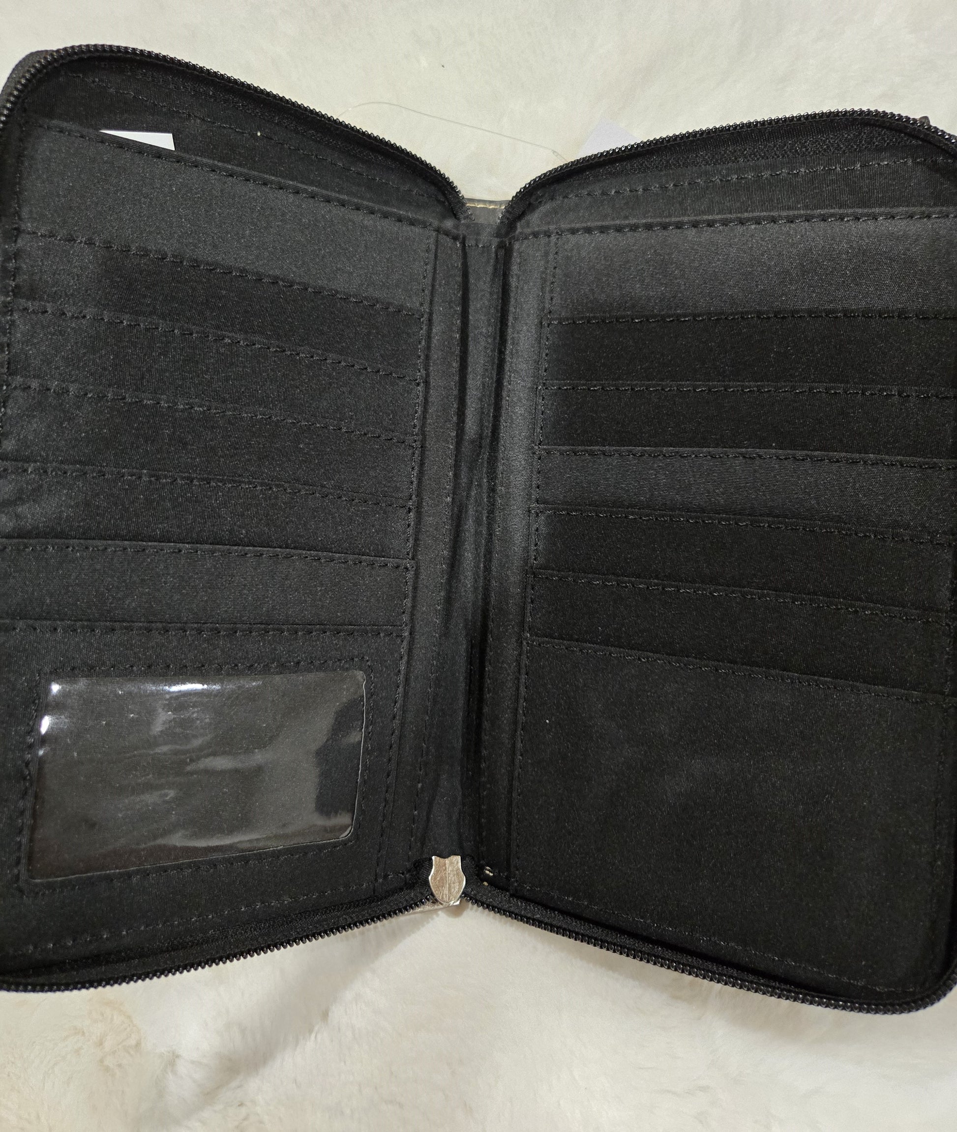 Comes with crossbody strap and wristlet. Attached wallet is spacious and holds many cards.